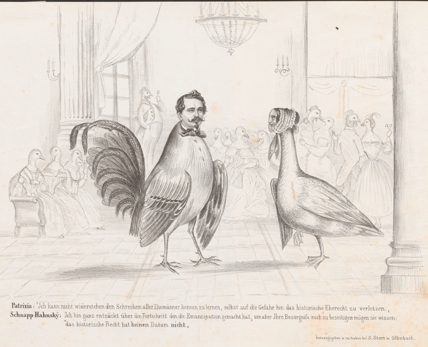 "Patrizia: Ich kann nicht widerstehen den Schrecken aller Ehemänner kennen zu lernen, selbst auf die Gefahr hin das historische Eherecht zu verletzen. Schnapp-Hahnsky: Ich bin ganz entzückt über den Fortschrit den die Emancipation gemacht hat, um aber ihre Ihre Besorgnis noch zu beseitigen mögen sie wissen: 'das historische Recht hat keinen Datum nicht'."